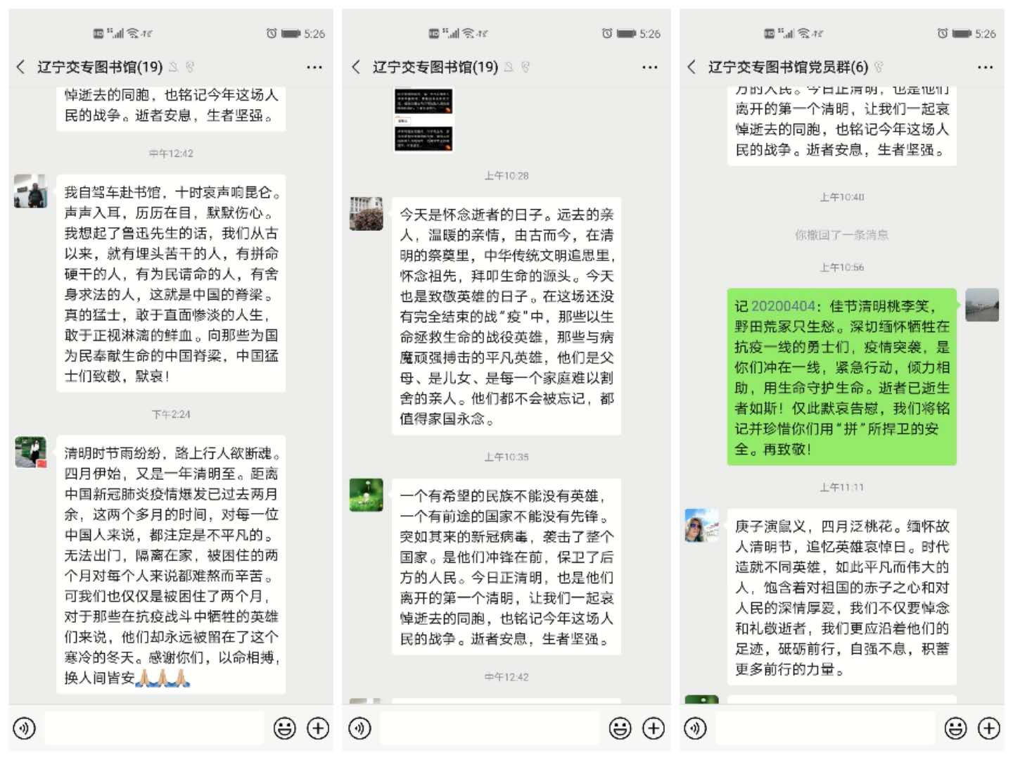 10:00,随着天安门广场下半旗致哀和鸣笛响起,图书馆党支部党员与全国人民一道,哀悼3分钟。默哀毕,每名党员以“勿忘逝者,致敬英雄”为题,在图书馆党支部微信群里、图书馆全体馆员微信群里提交了至少100字的感言和体会,向逝者致敬!