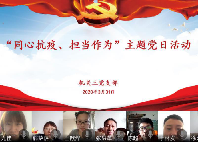 3月31日15:00,机关第三党支部利用网络平台召开“同心抗疫、担当作为”线上主题党日活动。此次会议有两项内容,一是学习《习近平总书记给北京大学援鄂医疗队全体“90后”党员回信》内容,二是结合实际工作对学习《回信》的感想进行充分讨论。会议由支部组织委员王楠同志主持。
