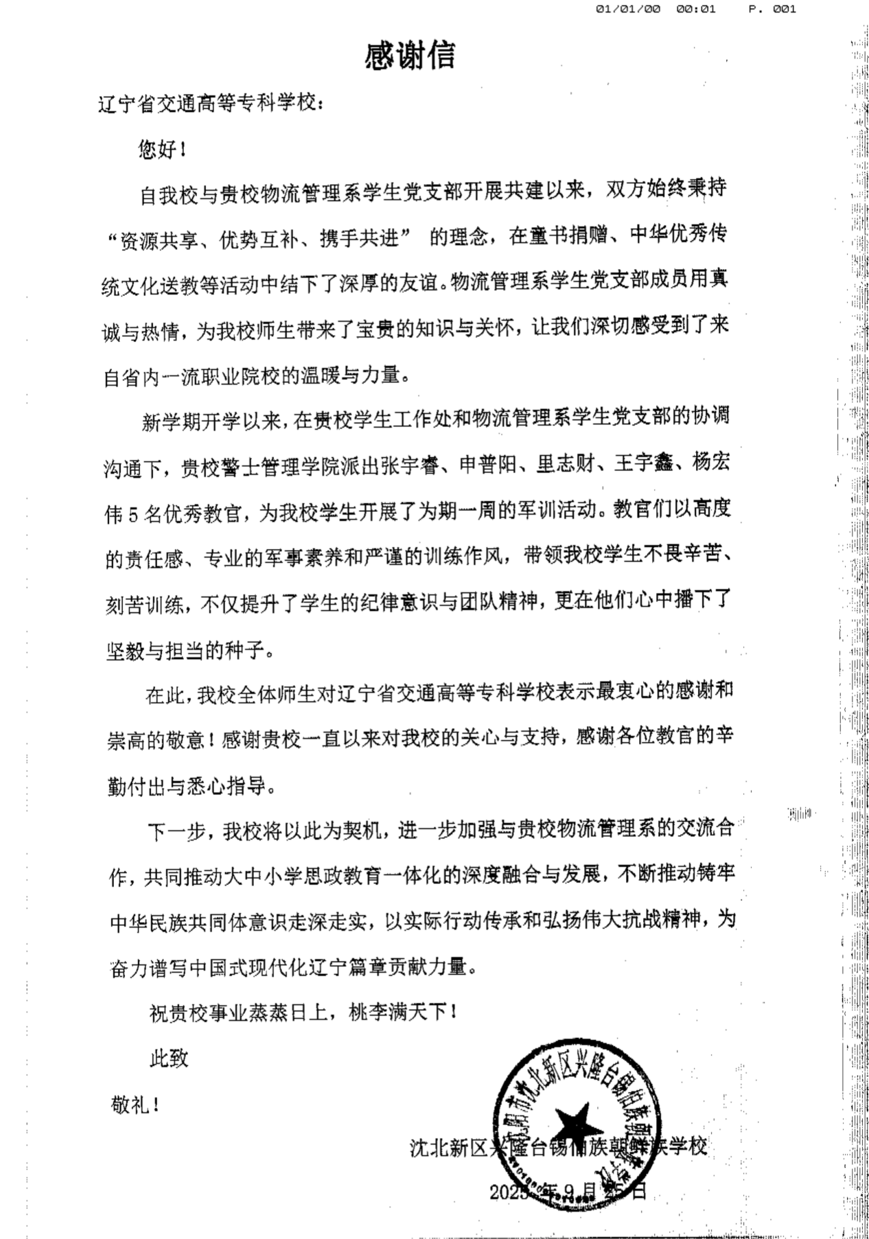 军训结束后,沈北新区兴隆台锡伯族朝鲜族学校向我校发来感谢信,表达了感谢与敬意。