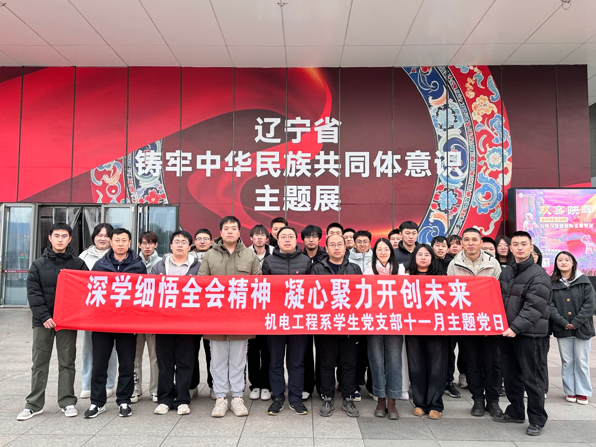 为深入学习贯彻党的二十届四中全会精神,锚定“服务辽宁全面振兴新突破”目标,推动理论武装与实践育人同频共振,11月26日,机电工程系学生党支部组织30名教工党员、发展对象及入党积极分子,开展“深学细悟全会精神 凝心聚力开创未来”主题党日活动。出发前,全体人员在机电208青年之家集中学习《中国共产党第二十届中央委员会第四次全体会议公报》及“十五五”规划建议核心内容,通过领学解读、要点研讨,精准把握全会关于高水平科技自立自强的部署要求,为实践学习筑牢思想根基。