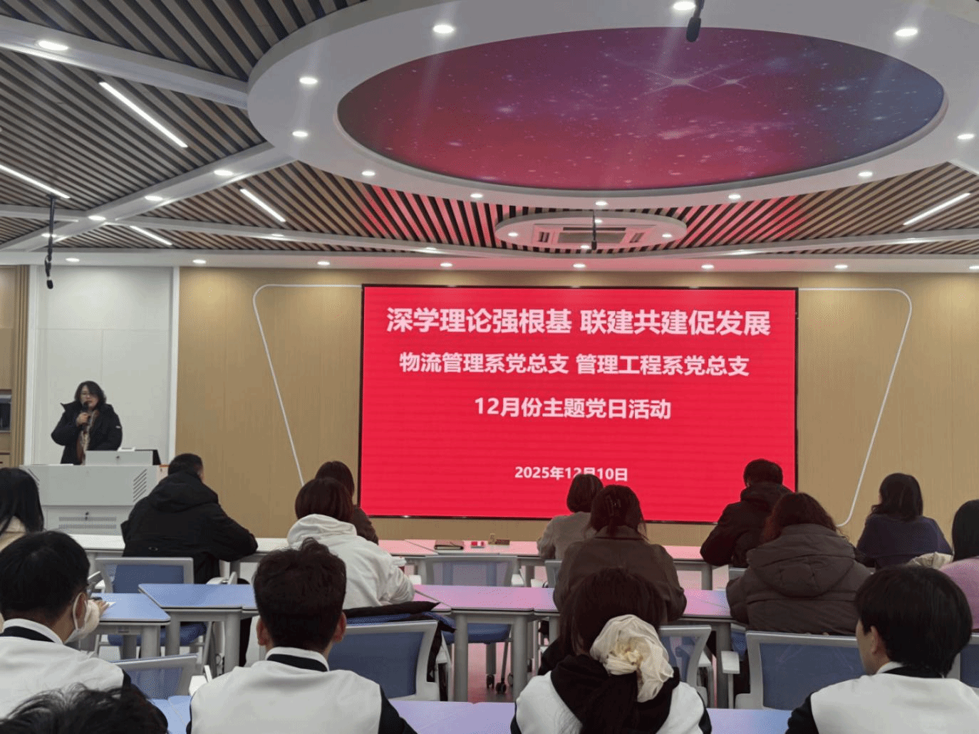 为深入学习宣传贯彻党的二十届四中全会精神,根据学校党委的统一部署,12月10日下午,物流管理系党总支联合管理工程系党总支在素质教育中心309教室成功举办以“深学理论强根基 联建共建促发展”为主题的12月份主题党日活动。物流管理系、管理工程系全体党员及入党积极分子参加活动。
