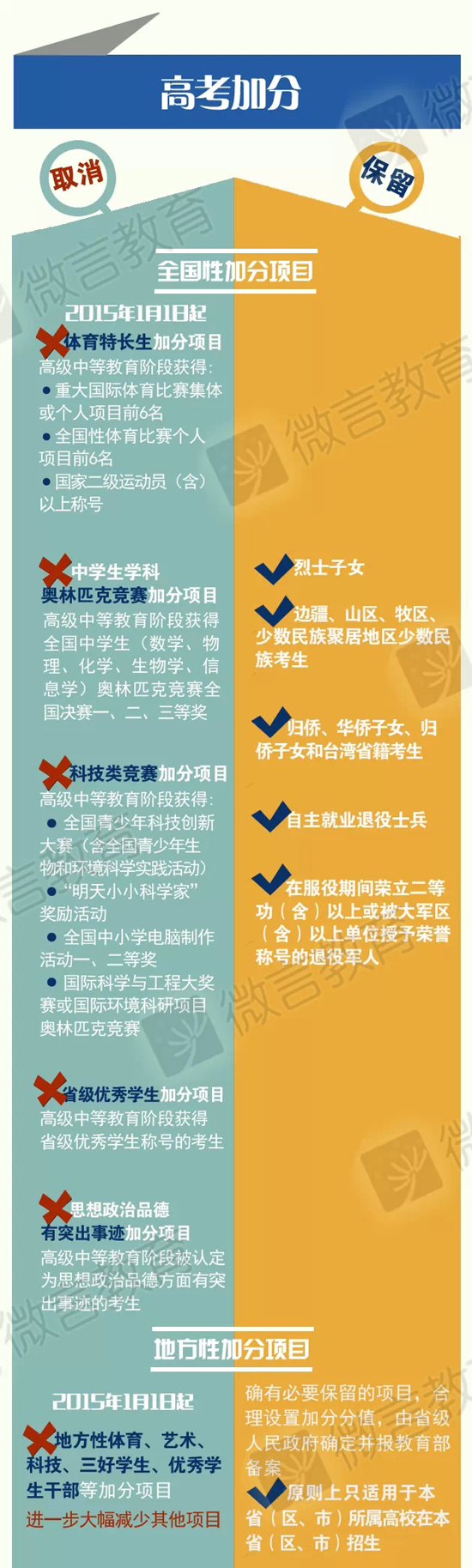 去年年底,教育部公布了《关于进一步减少和规范高考加分项目和分值的意见》。按照新政策,2015年1月1日起,将取消“奥赛”等5项全国性加分项目,只保留“烈士子女”等5类全国性加分项目。