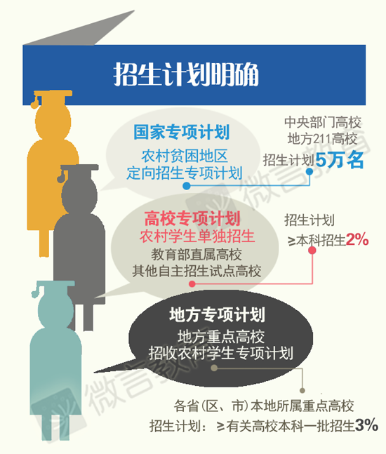 一是继续实施农村贫困地区定向招生专项计划(即国家专项计划),安排招生计划5万名,由中央部门高校和地方“211工程”高校为主的本科一批招生学校承担,实施区域为832个贫困县(包括所有集中连片特殊困难县和国家级扶贫开发重点县,含新疆生产建设兵团在新疆南疆三地州的22个团场),以及重点高校录取比例相对较低的河北、山西、安徽、河南、广东、广西、四川、贵州、云南、甘肃等省区。