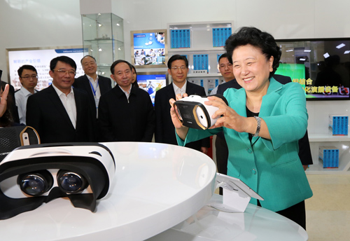 5月8日,在天津机电职业技术学院举行的2016年职业教育活动周启动仪式暨全国职业院校技能大赛开幕式结束后,国务院副总理刘延东考察了天津电视大学的展示活动现场,并亲自体验虚拟现实设备。中国教育报记者 樊世刚 摄