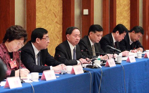 3月7日上午,教育部部长袁贵仁(左三)在全国政协十二届二次会议教育界别联组会上,虚心听取委员们对教育改革发展的意见和建议。记者 张学军 摄