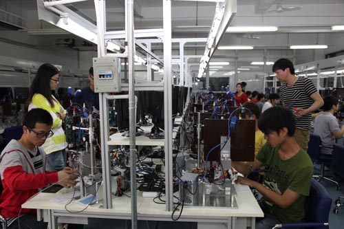 校企共建实训室。近两年,企业主动捐建和与学院共建校内实验室6个、研究所3个,共建共管校外实训基地22家。2013年7月,集团内成员企业广铁集团长沙供电段与学院签署共建协议,由长沙供电段提供一台铁路接触网作业车给学院,建设“接触网练兵实训基地”,为电气化铁道供电专业学生和员工提供专业技能实训练兵场地、相关专业课程实训场地和实验教学场地。珠海伟创力公司提供SMT生产设备,捐建电子产品生产实训室;广东佛山南海益晶科技公司提供生产设备,与学院共同筹建校内半导体存储器测试生产车间;上海ABB工程有限公司正在与学院协商共建工业机器人应用技术创新中心。