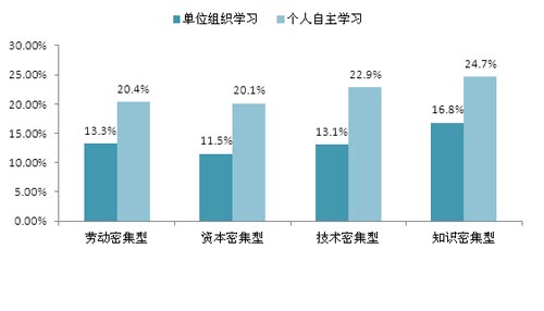 调查数据显示,不同性质企业的员工在自我培训和单位培训方面都存在差异。知识密集型企业职工相对于劳动密集型、资本密集型和技术密集型企业职工,无论在单位组织培训方面还是在个人自主学习方面,每个月超过15小时学习时间的比例都是最高,分别占职工的16.8%和24.7%。(见图3)