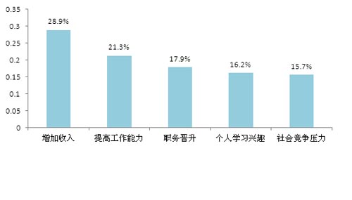 调查数据显示,提高工资收入水平是职工参与企业学习培训最根本的驱动力。在社会竞争压力、提高工作能力、增加收入、职务晋升和个人学习兴趣这五个驱动因素中,增加收入的需求是激发职工提升自身素质的最大动力,28.9%的人认为这一因素是其参加培训最强烈的动机;提高工作能力是职工参加培训第二大激励因素,21.3%的人认为这一因素是其参加培训最强烈的动机;职务晋升需求是职工提升自身素质的第三大动力,个人学习兴趣和社会竞争压力对提升职工自身素质意愿的影响程度最低。(见图4)