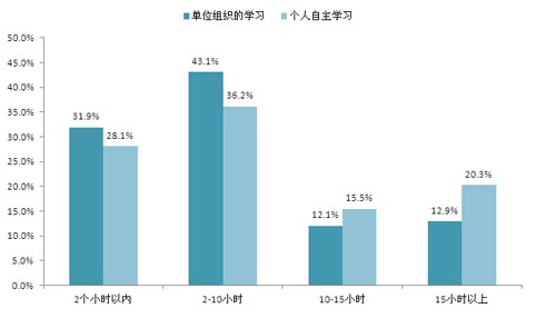 企业职工学习具有自身特点,具体体现一是学习时间零碎,主要是利用工作之余学习。往往承受工作家庭生活的双重压力,难以有大段的时间安排学习。从调研来看,目前我国职工的工作负荷较大,需提高职工学习培训时间。目前无论是单位组织的培训时间还是个人自主学习时间,职工参加各类学习与培训每月花费的时间在“2-10小时之间”的占比最多:其中参与单位组织的培训学习时间在2-10小时之间,占比43.1%;个人自主学习在此时间段的比例为36.2%。就学习方式而言,职工个人自主学习时间超过参与单位组织学习时间。(见图1)