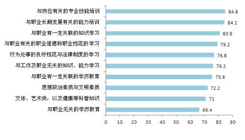 调查数据显示,职工对培训内容最感兴趣的有四个方面:一是与岗位有关的专业技能培训;二是与职业长期发展有关的能力培训;三是与职业有一定关联的知识学习;四是与职业有关的职业道德和职业规范的学习。这四方面重要性的平均得分分别为84.8、84.2,80.8和79.2分,充分体现职工的“爱岗敬业”,显示出职工在自我成长上的方向和目标。同时,与职业无关的学历教育被认为是最不重要的。(见图2)