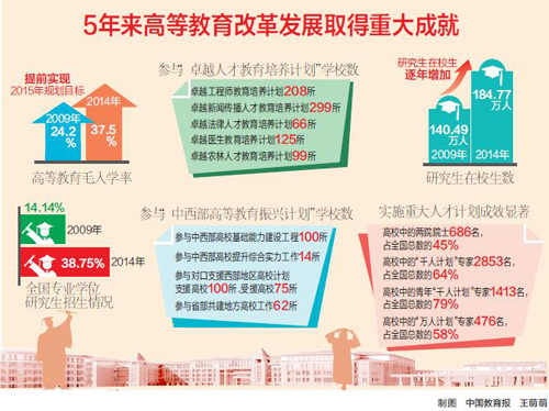 本报北京12月4日讯(记者 万玉凤 见习记者 凌馨)今天,教育部举行第五场教育规划纲要实施5周年发布会,介绍高等教育专题评估有关情况。评估报告显示,教育规划纲要实施5年来,尤其是党的十八大以来,我国高等教育整体质量和水平明显提升,国际竞争力显著增强,为实现我国从高等教育大国走向高等教育强国奠定了坚实的基础。截至2014年底,我国高等教育毛入学率达到37.5%,在校生规模达到3559万人,居世界第一,提前完成预定的阶段目标。