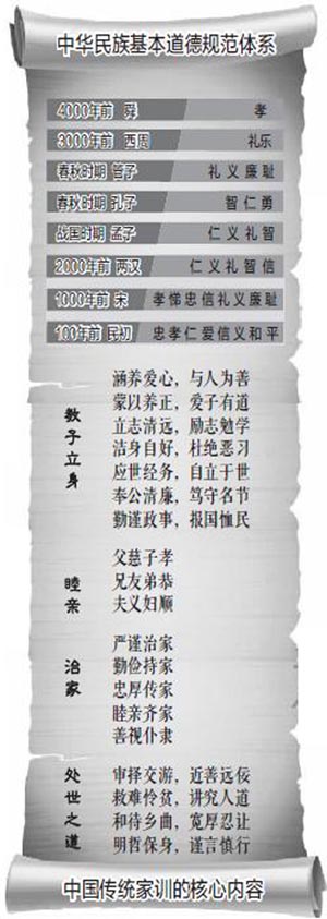 现在的家庭教育要重视中华民族传统道德之美的价值,根据孩子人格形成的规律,小学阶段注重孝、礼、勤、诚、耻的品德习惯养成,中学阶段注重忠、信、义、宽、廉的道德理性与公民道德的培养。“十德”的修炼,必为孩子成为堂堂正正的中国人,进而接纳社会主义核心价值观,奠定坚实的基础。
