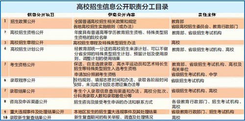 一是招生政策公开。教育部制定的全国普通高校招生相关政策和规定,各省级高校招生委员会、教育行政部门据此制定的实施细则或办法。