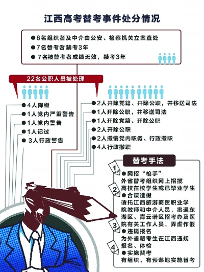 时隔一月,7月7日,江西省教育厅发布通报称,截至目前,根据公安部门和联合调查组已查明的有关事实,共处理各类人员42人,其中涉及22名公职人员。根据教育部第33号令有关规定,对7名被替考考生和7名替考者给予相应处罚。目前,当地公安、检察机关仍在进一步调查案情。
