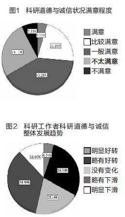 通过科研道德与诚信状况满意程度我们可以看到,对科研道德与诚信状况现状持“满意”或“不满意”这两种极端态度的人占比比较少,分别为4.32%和7.35%;大部分人对现状持比较中立的态度,其中一般满意、不太满意与比较满意分别为40.29%、26.10%与21.95%。