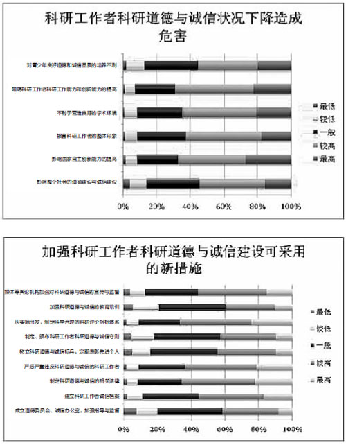 (1)对人们道德标准高低最具有影响力的5个因素是:“传统文化中的‘官本位’等消极观念”、“行政干预,追逐小集团利益”、“社会舆论宣传导向不明,褒贬不力”、“急功近利思想严重”、“科研道德方面的自律意识薄弱”。由此可知,如果国家采取相关政策提高科研工作者的道德标准,首先要从这5个方面加以教育与治理。