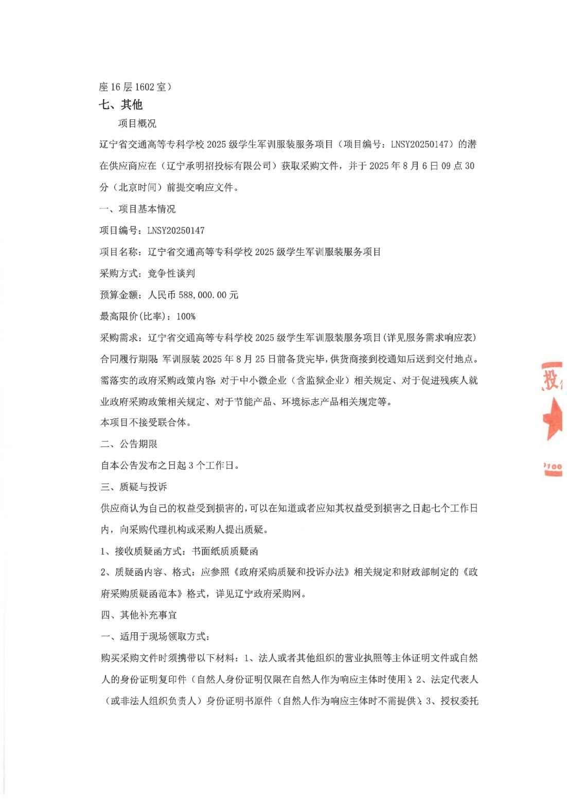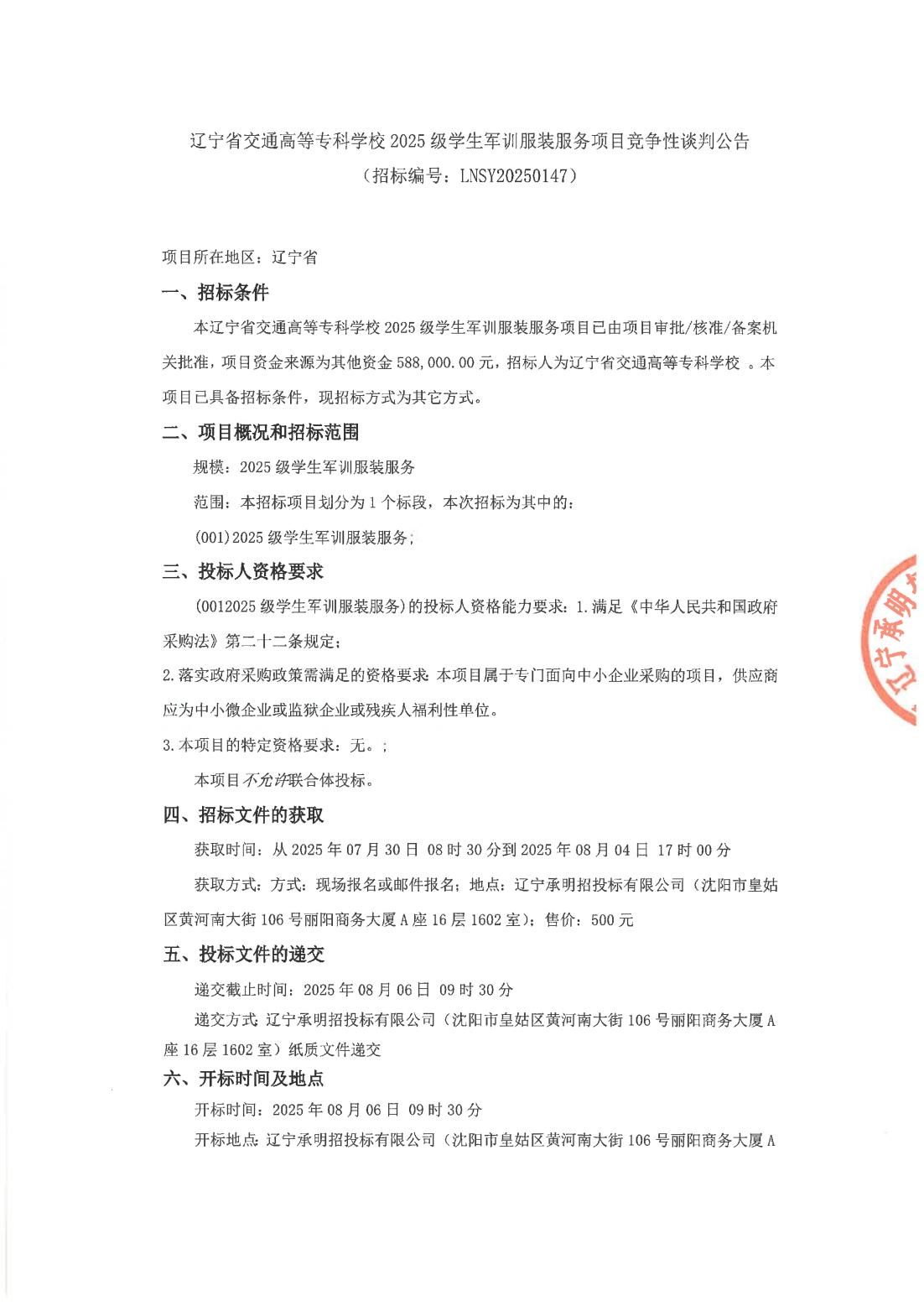 2025级学生军训服装服务项目竞争性谈判公告二次(LNCC2025076)