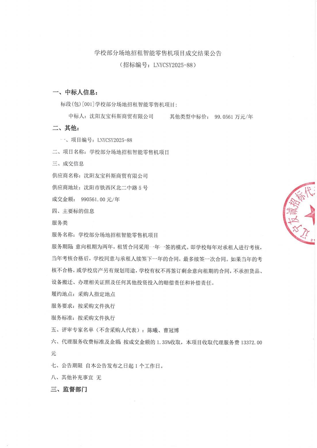 学校部分场地招租智能零售机项目结果公告(LNCC2025091)