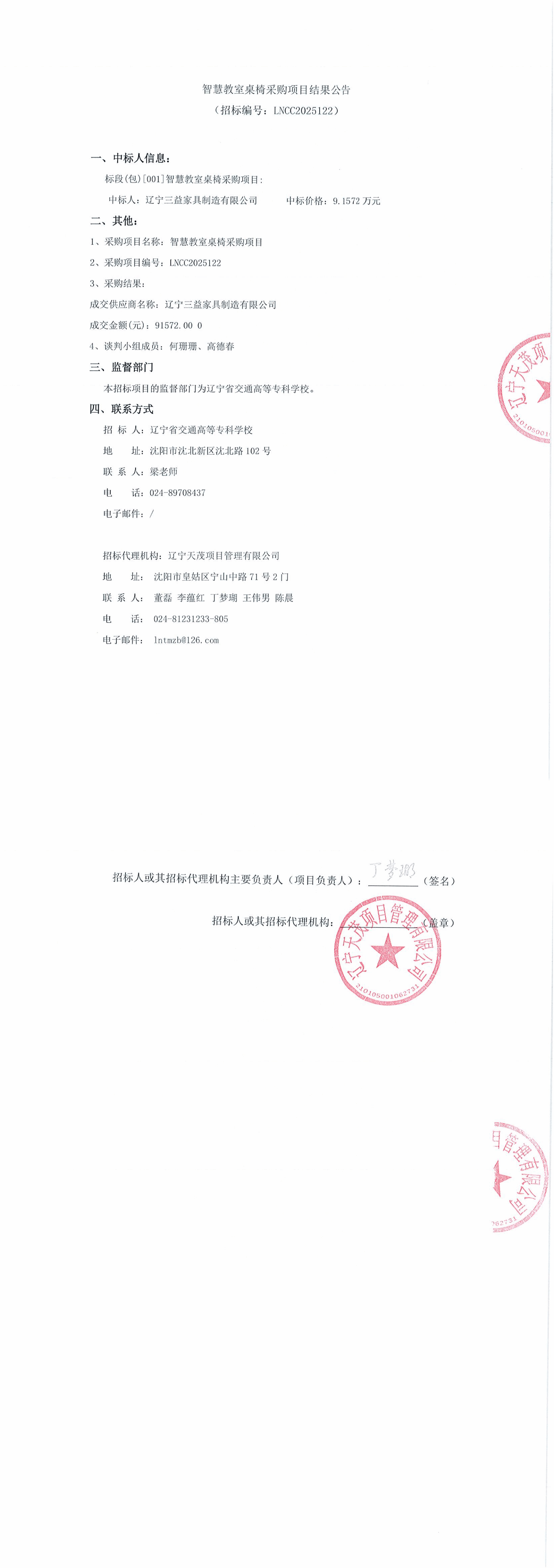 智慧教室桌椅采购项目结果公告(LNCC2025122)
