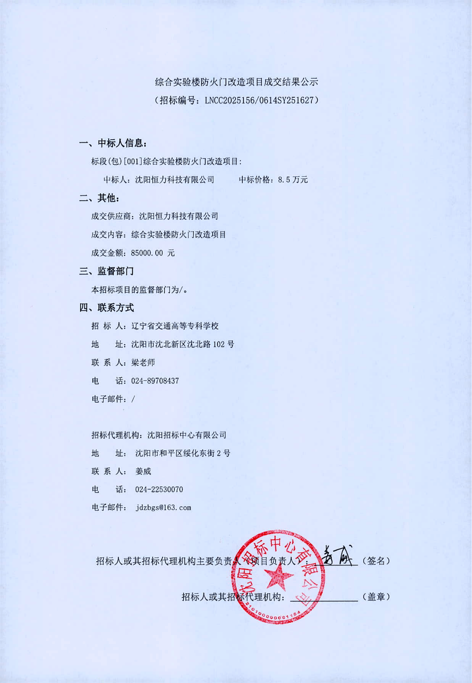 综合实验楼防火门改造项目成交结果公告(LNCC2025156)