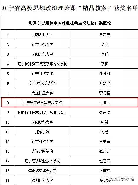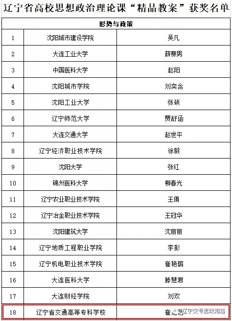 根据《辽宁省教育厅办公室关于开展辽宁省高校思政课“精品教案”评选的通知》(辽教办〔2020〕13号)要求,经高校申报推荐,专家通讯评审,共有118人获奖。其中,“马克思主义基本原理概论”15人获奖,“毛泽东思想和中国特色社会主义理论体系概论”29人获奖,“思想道德修养与法律基础”30人获奖,“中国近现代史纲要”16人获奖,“形势与政策”18人获奖,“中国特色社会主义理论与实践”7人获奖,“中国马克思主义与当代”3人获奖。