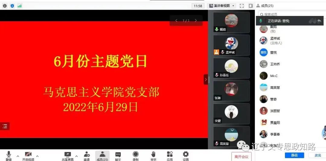 按照学校党委宣传统战部下发的《关于深入学习贯彻习近平总书记给南京大学留学归国青年学者重要回信精神的通知》要求,马克思主义学院党支部立即号召党支部全体党员深入自学回信精神,并于2022年6月29日通过腾讯会议开展6月份线上主题党日的方式组织全体党员集体深入学习贯彻回信精神。学习贯彻回信精神通过领学回信原文和分享学习心得的方式开展。