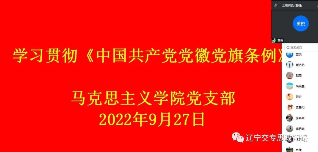 为持续深入贯彻落实《中国共产党党徽党旗条例》(以下简称《条例》),马克思主义学院党支部于2022年9月27日开展了9月份主题党日活动。主题党日活动由党支部书记董悦同志主持,党支部全体党员通过腾讯会议线上方式参加。