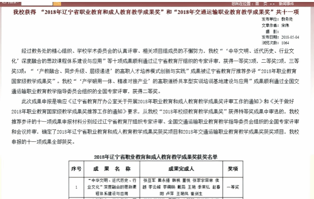 教学成果 当前位置: 首页 > 教学工作 > 教学成果 > 正文 2018年辽宁省职业教育和成人教育教学成果奖 发布时间:2025-12-08 18:58 浏览量: 教师姓名:集体项目名称(赛项全称):2018年辽宁省职业教育和成人教育教学成果奖获奖等级:省级一等奖主办单位(盖章单位):辽宁省教育厅获奖日期(年月):2018年4月成果佐证: 上一条:第十三届辽宁省高校思想政治理论课教学大赛