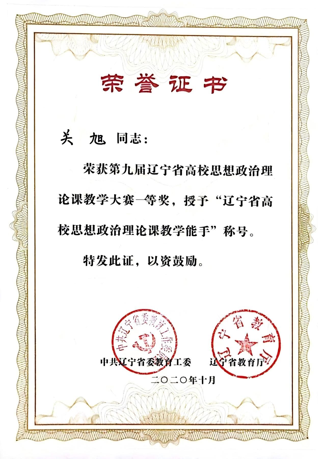 教学成果 当前位置: 首页 > 教学工作 > 教学成果 > 正文 第九届辽宁省高校思想政治理论课教学大赛 发布时间:2025-12-08 19:01 浏览量: 教师姓名:关旭项目名称(赛项全称):第九届辽宁省高校思想政治理论课教学大赛获奖等级:省级一等奖主办单位(盖章单位):辽宁省教育厅获奖日期(年月):2020年10月成果佐证: 上一条:第八届辽宁省高校思想政治理论课教学大赛 下一条:第十届辽宁省高校思想政治理论课教学大赛