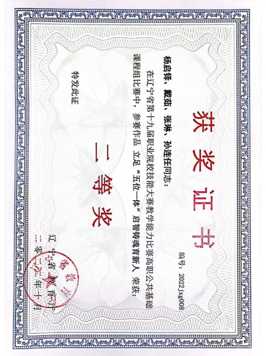 教学成果 当前位置: 首页 > 教学工作 > 教学成果 > 正文 辽宁省第十九届职业院校技能大赛 发布时间:2025-12-08 19:01 浏览量: 教师姓名:杨启铎 戴茹 张琳 孙连任项目名称(赛项全称):辽宁省第十九届职业院校技能大赛获奖等级:省级二等奖主办单位(盖章单位): 辽宁省教育厅获奖日期(年月):2022年10月成果佐证: 上一条:第十四届辽宁省高校思想政治理论课教学大赛 下一条:第十四届辽宁省高校思想政治理论课教学大赛